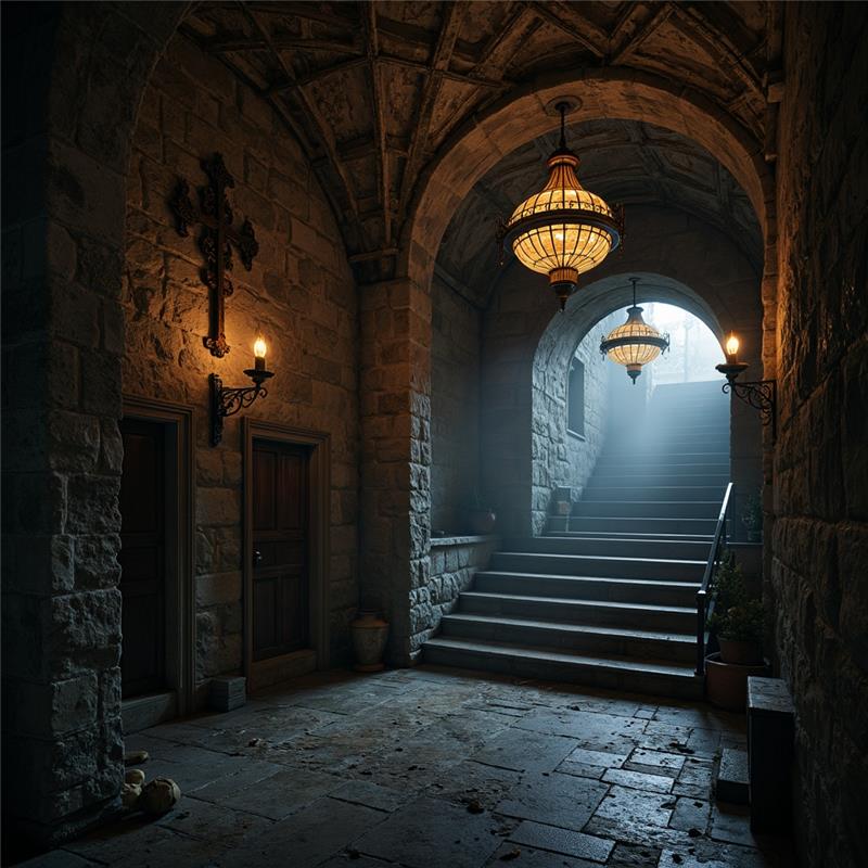 Die Tür fällt hinter euch zu. Im Keller ist es still und kühl. Zwischen alten Kisten entdeckt ihr ein kleines Messingschild mit dem gleichen Symbol wie im Manuskript.